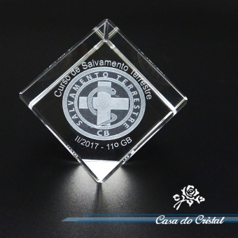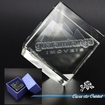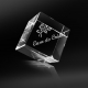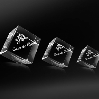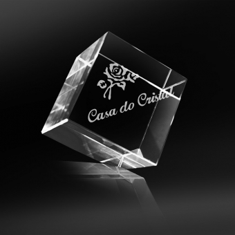 Cubo de cristal óptico com bico chanfrado e gravação interna a laser.